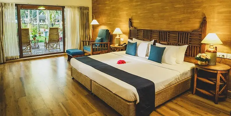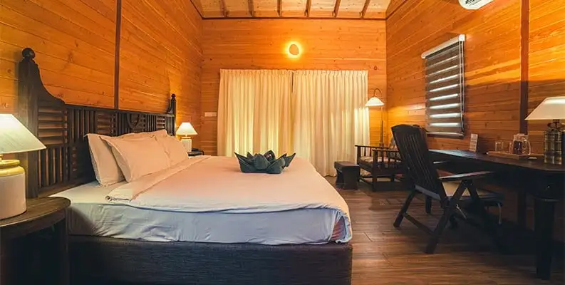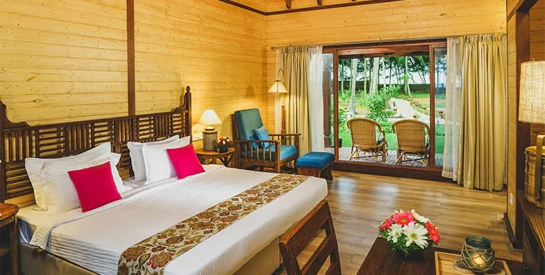 Find comfort and luxury nestled amidst the expanse in our Stone Cottage twin setups at Bela Kera, Thrissur - Kerala. Each of the twin cottages boasts area dimensions of 421 sq. ft. and comes adorned with unique wooden furniture pieces, which serve as fashion statements blending well with serenity and natural surroundings. Enjoy the luxury of an attached bathroom that extends into the open-to-sky shower area, beckoning rejuvenation under the stars. These cottages are fusion personified with RO-purified hot and cold water facilities that combine rustic style with modern convenience to offer a stay that's relaxing and rejuvenating in every sense. Experience luxury living in the lap of nature with our Luxury Stone Cottages.